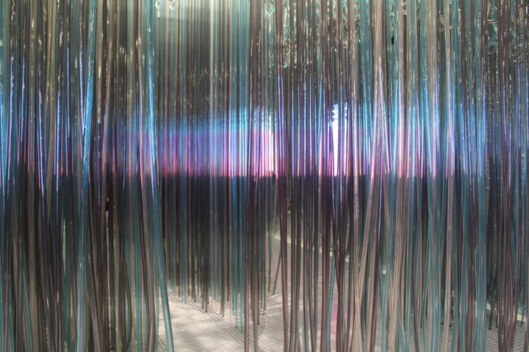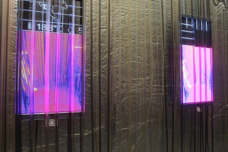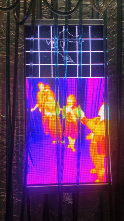 それぞれのエリアには、縦型のサーモモニターが設置されていて、その周りにいる人の体温や環境の温度を計測して色で表示している。それをみると今自分がいる辺りの温度が大体わかるよになっていて、エリアを移動すると周りの温度が変わるのがわかる。同時に自分がどの温度帯を一番心地良いと感じるかも確認できる。