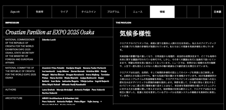 また、クロアチアパビリオンでは季節を通して、日々絶え間なく変化する環境になっているので二度と同じ環境を繰り返すことはなく、来館者は来るたびに違う環境を体感することになる。そうすることで気候多様性の個人やコミュニティに対する大きな影響に関して考えてもらいたい、という思いを込めている。
