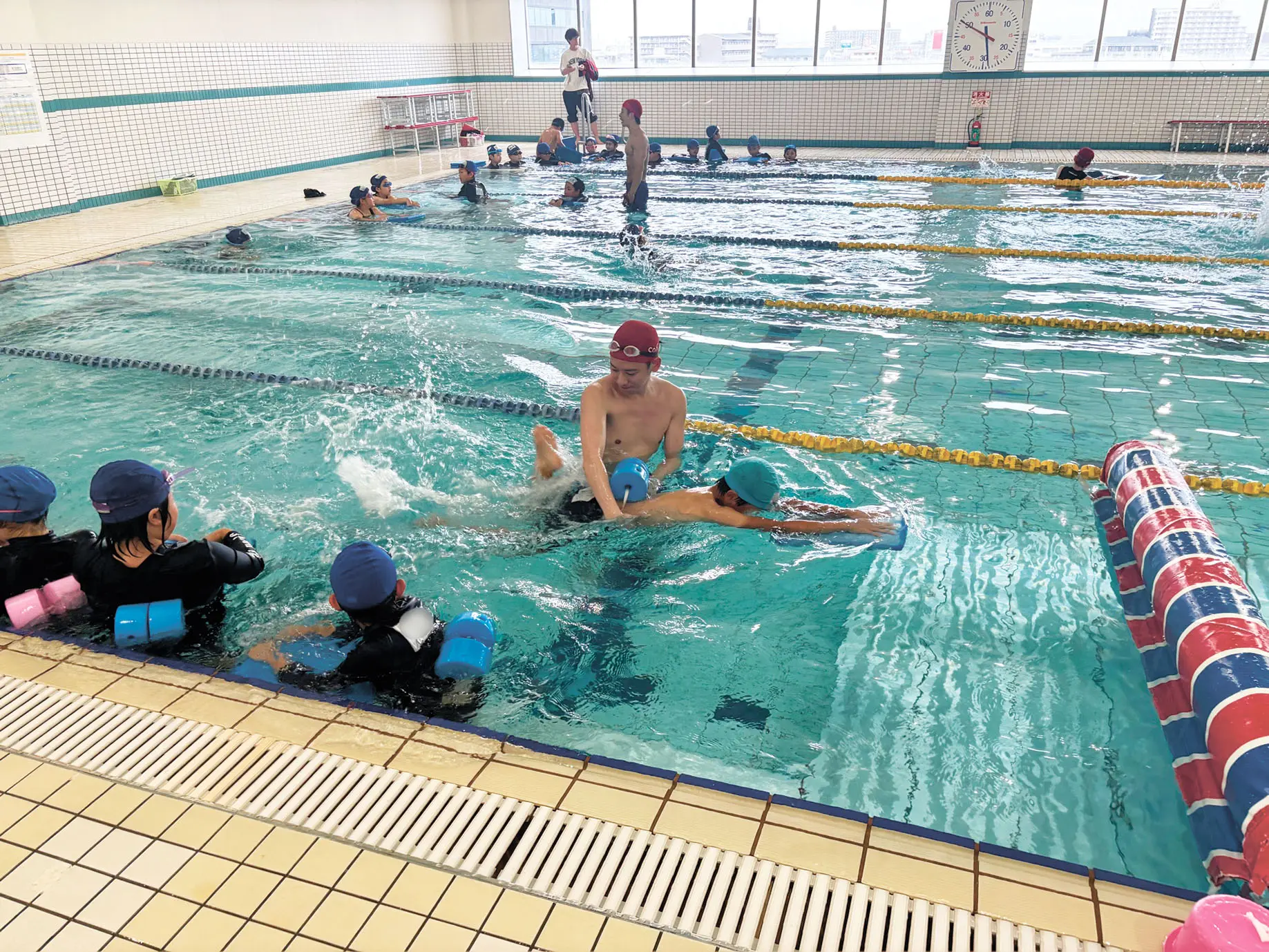 同市立灰塚小学校の児童が6月3日、市内のショッピングセンター「ポップタウン住道オペラパーク」内にある「コ・ス・パ住道店」の温水プールで授業を実施。当日は雨天だったが、3回に分け約260人の児童がインストラクター10人から泳力別の指導を受けた。児童からは「雨でもプールの水が温かくて良かった。コーチも優しく、たくさん泳げて楽しかった」との声が聞かれた。