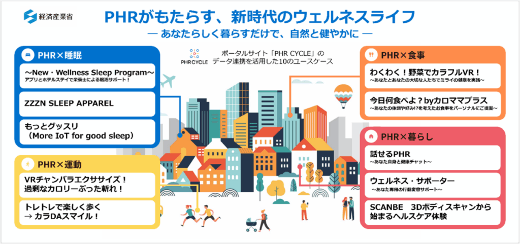 PHR(Personal Health Record)とは個人の健康医療情報のこと。PHRを活用することで、個々人にパーソナライズされたヘルスケアサービスの創出が可能となることを期待した未来社会へ向けてのサービスを体験できる。サービス内容は運動・食事・睡眠・ライフスタイルと多岐にわたり、〝あなたらしく暮らすだけで自然と健やかになれる〟、未来の健康社会の可能性を体感してもらう。
