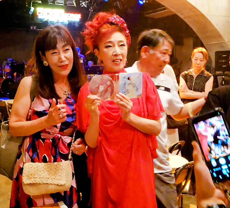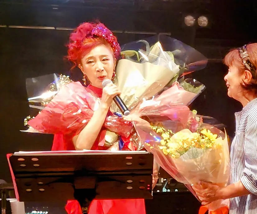 歌手生活55周年記念曲「想い出は翼」や55周年記念曲「願い」(2021年)をはじめ、橋幸夫とのデュエットでヒットした「今夜は離さない」(1983年)など十数曲を熱唱。五条哲也ら後輩歌手多数が駆け付け、持ちきれないほどの花束を次々手渡し祝福した。