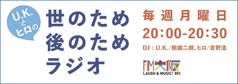 FM大阪で毎週月曜20時から、ヒロさんとラジオDJでタレントのU.K.さんで「世のため後のためラジオ」を放送中!
