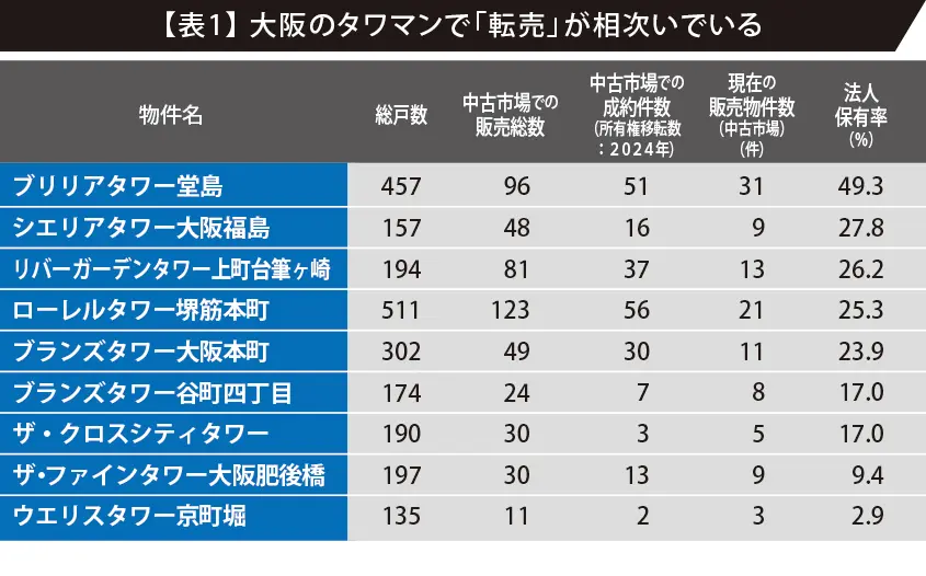 【表1】に過去2年間で新築引き渡しのあったタワマンの法人保有率と転売された住戸の数を示した。既に総戸数の2割以上が転売に出されている物件もある。中古市場での成約件数(所有権移転)も多く、活発な売買が行われている。
