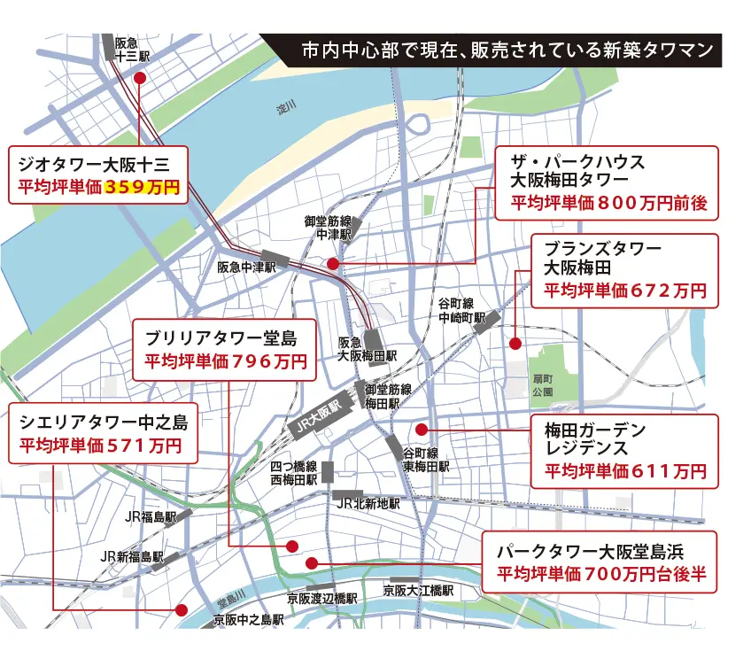 「グラングリーン大阪ザ・ノースレジデンス」(大阪市北区)の住戸が関西最高額となる25億円で販売されたことは記憶に新しい。従来の最高額は「ブリリアタワー堂島」(同)の10億8000万円。地主から土地を借り、将来的に土地と建物を返却する定期借地物件「シエリアタワー中之島」(同市福島区)の最高額は4億3999万円。定期借地権は所有権に比べて割安になることが一般的だが、同物件はそんな常識を覆し、第1期の平均販売価格は1億1287万円だったという。少し前まで「億ション」は珍しい存在だったが、今、大阪の都心部において「1億円超え」は当たり前。まさに「タワマンバブル」の様相を呈している。