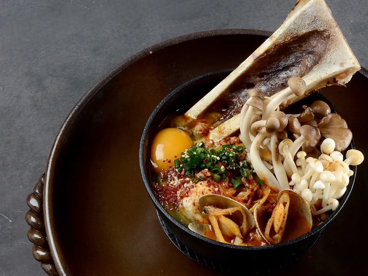 スンドゥブのスープは、日本と韓国の伝統出汁をブレンドし、味噌で味わいのバランスを調和しながら数時間かけて煮込み、辛さの中に旨味を感じる豊かな味わいが楽しめる。おすすめは、オプションで追加できる牛の大腿骨「モアル」。コラーゲンを豊富に含み、ワイルドな見た目で写真映えも抜群だ。モアルの骨のくぼみに詰まった肉を削いでスープと一緒に味わうと、和韓出汁のまろやかさとコクが一層引き立つ。