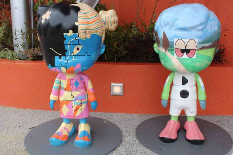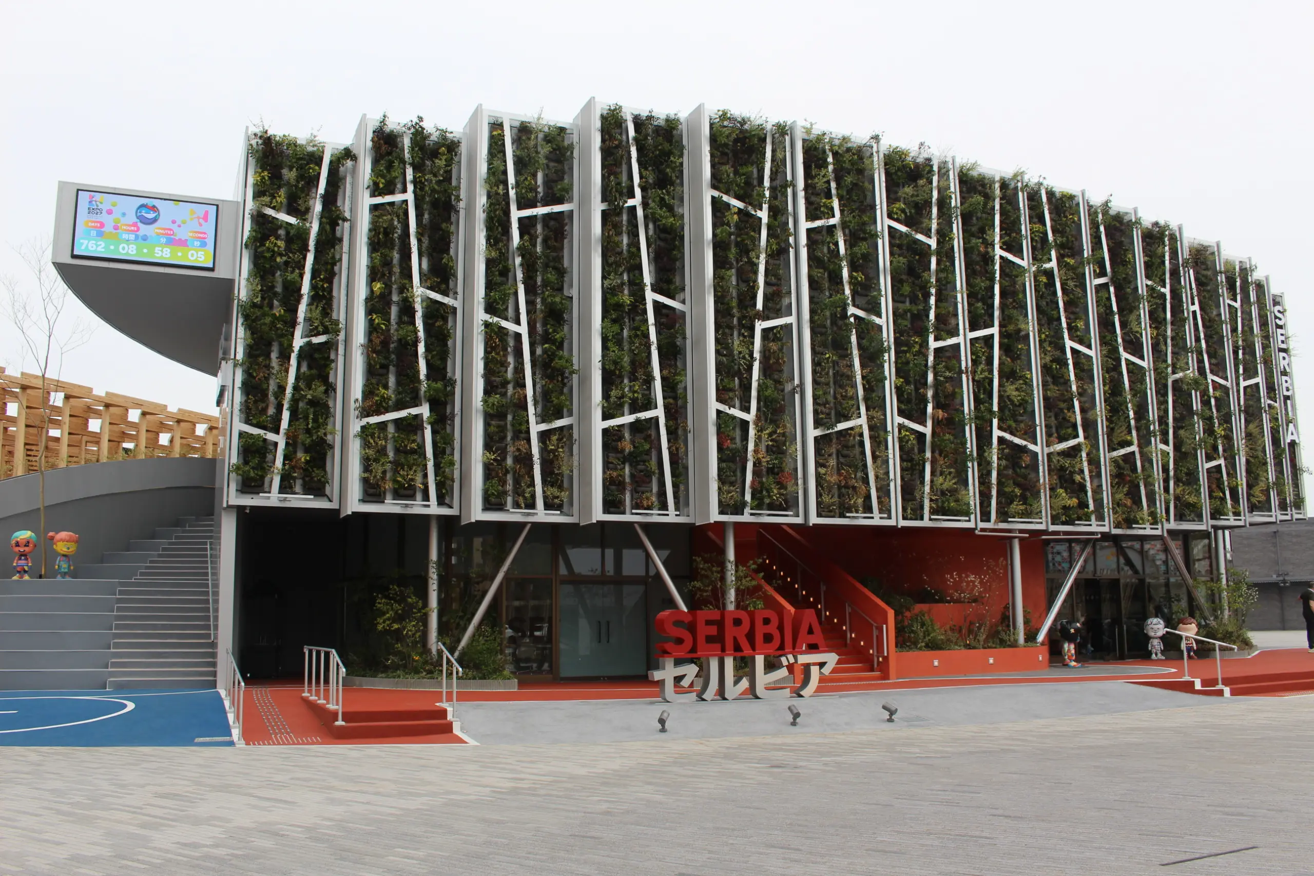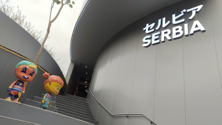 アーティスティックなデザインの男の子と女の子の像が置かれているセルビアパビリオン。