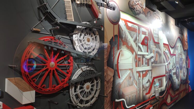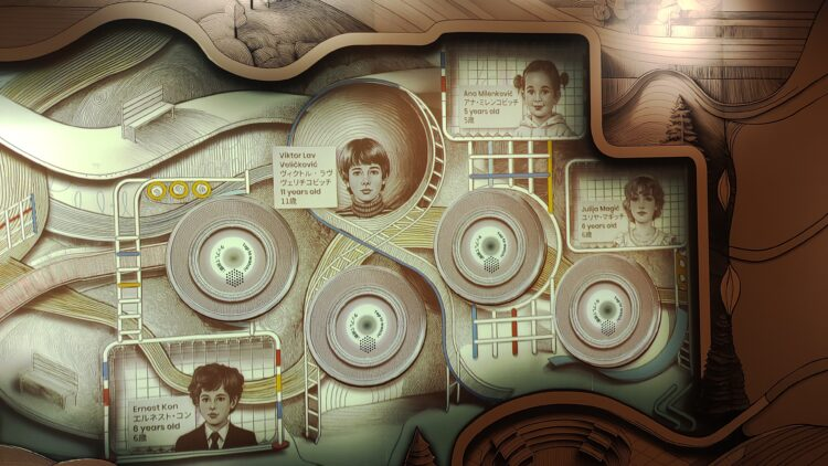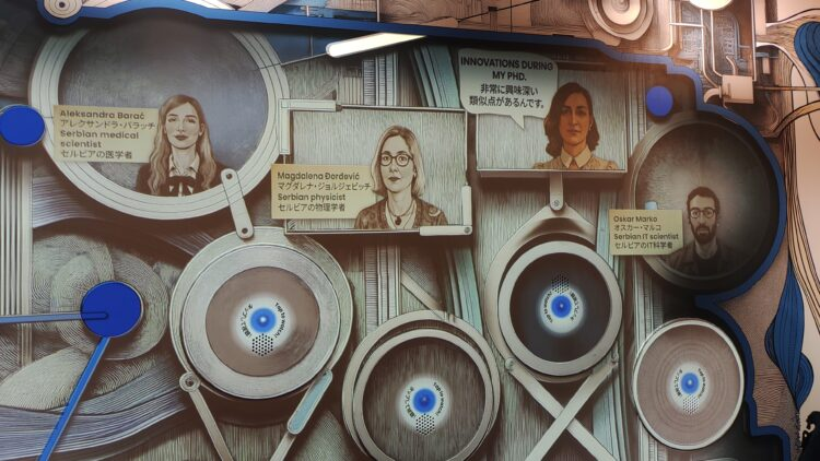 セルビアの人たちが録音した声を聞いたり、自分の声を録音したり、と少し遊びの要素の入った体験型展示がある。壁に設置された装置にビー玉を入れると仕掛けの中を通って一番上まで行き、そこから今度は落ちて行くのだが、落ちる場面は壁に表示されているデジタルのコースを通り、最後に本物のビー玉がまた出てきて元の位置に戻るという仕組み。