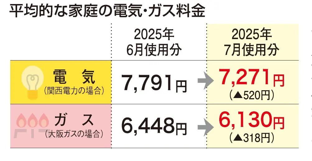 電気・ガス料金 再び補助スタート 8月の請求分から testtesttest 暮らし 2025.07.14 物価高と猛暑対策を目的として、政府は電気・ガスの料金値引きを今年8月請求分から10月請求分まで予定通り実施する。エアコンなどの冷房機器により、家庭の電気使用量が多くなる傾向にある、7~9月使用分での実施となる。 一般家庭(低圧)の場合、電気は7、9月使用分が1㌔㍗アワーあたり2・0円の値引き、8月は同2・4円の値引き。また、ガスは7、9月使用分が1立方㍍あたり8円の値引き、8月は同10円の値引きが適用される。10月以降の支援継続は未定となっている。