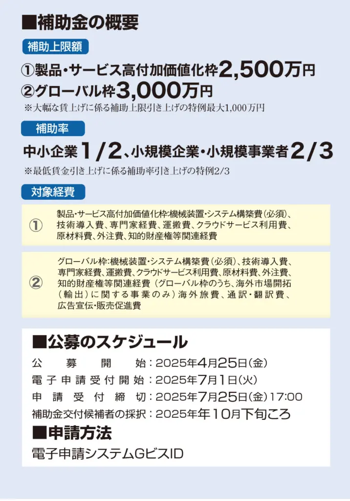 申請枠は、① 製品・サービス高付加価値化枠、② グローバル枠の二つに分かれています。これに加え、大幅な賃上げや最低賃金引き上げに取り組む事業者に対しては、補助上限額又は補助率が引き上げられる特例措置も設けられています。