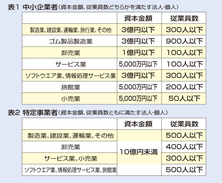 対象となるのは、表1に掲げる中小企業者・小規模事業者のほか、表2に該当する資本金10億円未満の特定事業者。さらに、組合又は連合会、特定非営利活動法人、社会福祉法人などの団体も申請が可能です。