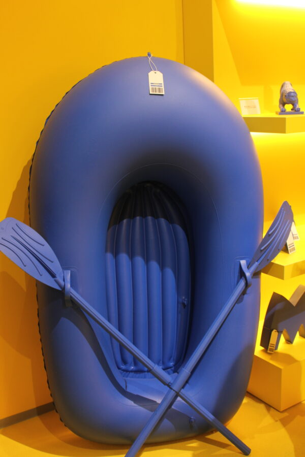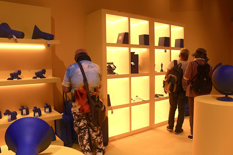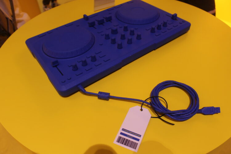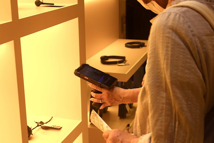 館内では、ハンドヘルドのコードリーダーを受け取って、棚やテーブル上に置かれているブルーのグッズについているタグのバーコードを読み取るとハンドヘルドの中のスクリーンに映像が流れ出す。