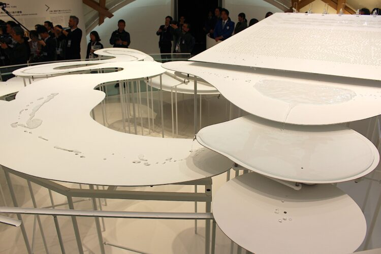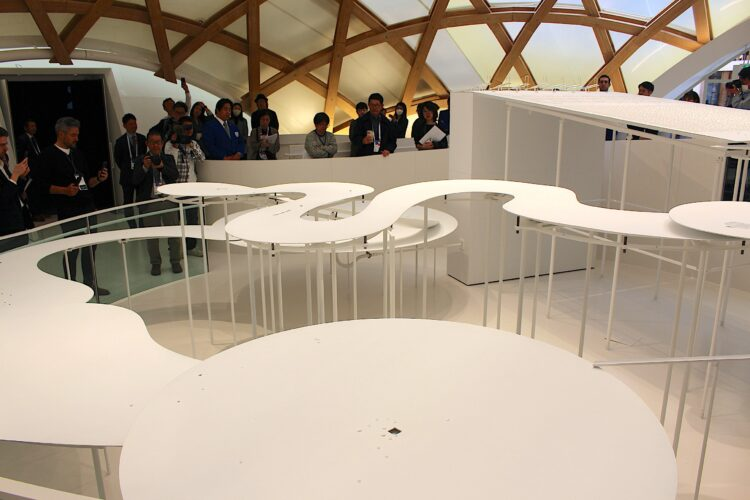 ブルーオーシャン・ドームは、3つの半球体からなるパビリオンで、ドームAは白に統一された空間の真ん中に超撥水の技術を使った素材の上を水が滑るように流れていく様を演出。自然界の水の循環を表現しているが、いつまでもずっと見ていられそうな美しさと安らぎのような感覚を感じた。