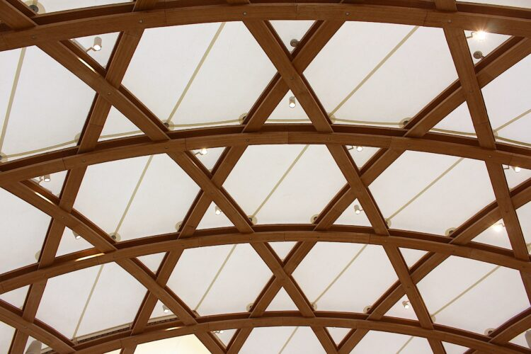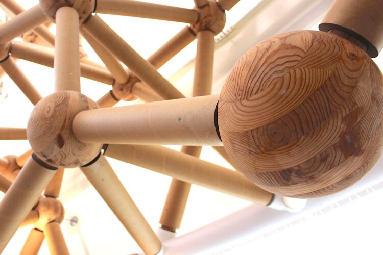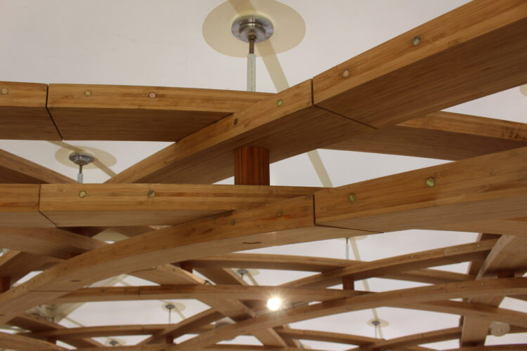 ドームAは竹を割って、蒸して、くっつけて集成材加工すると安定して木より強い強度を持つようになるのでそれを骨組みに使い、ドームBは世界初のカーボンファイバー炭素繊維強化プラスチックを主体構造として屋根を作り、ドームCは骨組みやイスのパーツとして段ボールを紙管にして使用、と次世代を見据えた素材でパビリオンを建築しているのだ。