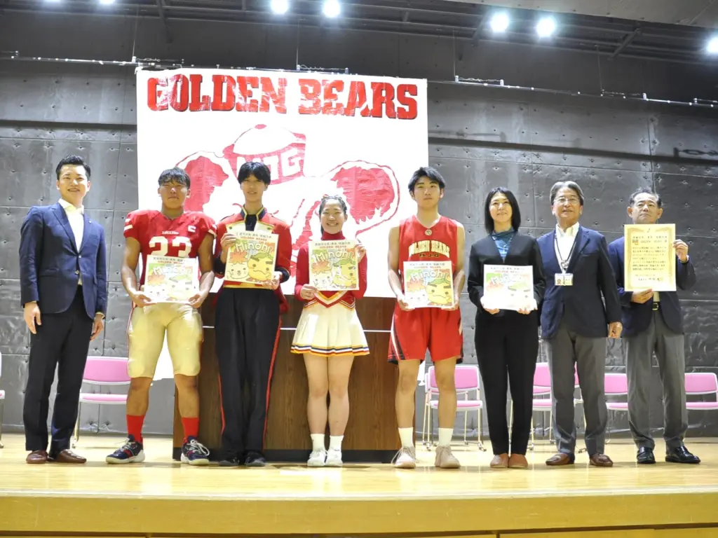 箕面自由学園高等学校(理事長・松矢康彦)の強化クラブ「GOLDEN BEARS」が、箕面市の特命大使「箕面元気・勇気・笑顔大使」に就任した。7月23日、同校の桂門ホールで就任式が行われ、原田亮箕面市長から特命大使の称号とステッカーが授与された。