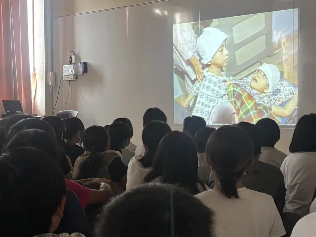 当日は、本作のプロデューサー・リントン貴絵ルースさんも来校し、「ドクさんは平和のために、自らのすべてをさらけ出して語ってくれた。平和は話し合い、語り継ぐことで守られる」と児童に語りかけた。