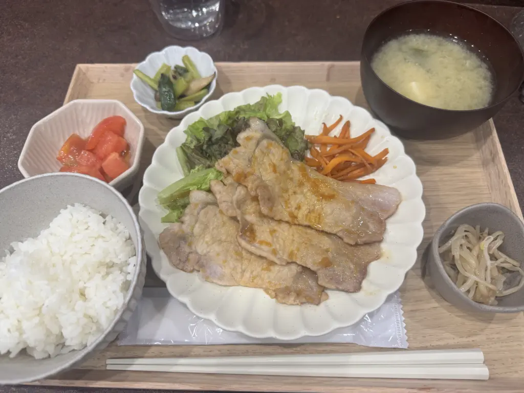 開店初日に記者が足を運ぶと、日替わりの「一汁六菜ランチ」(1250円)が登場。豚肉や焼き魚、煮物など主菜に加え、野菜を中心とした小鉢が並び、ボリュームと栄養のバランスを両立した内容となっている。