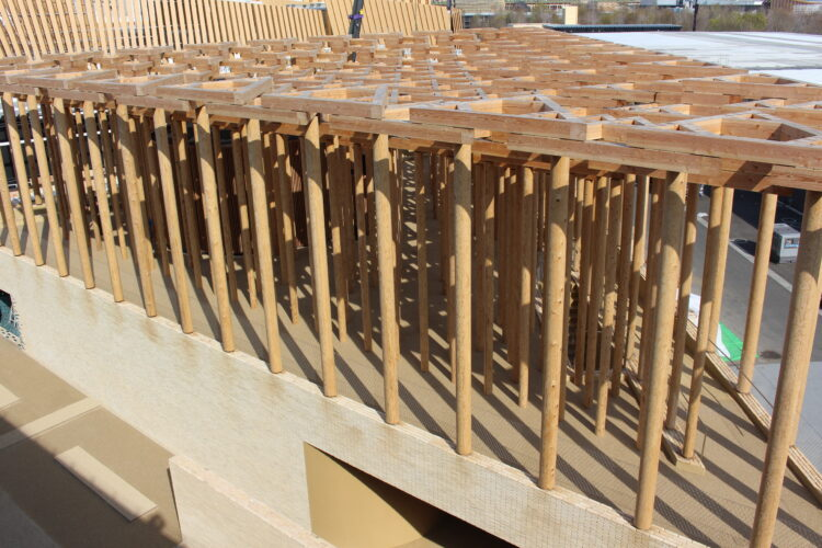 開放的なテラスであるこのエリアには関西圏から切り出してきた木材を使用した柱が286本立ち並び、日よけの役割を果たしながら、アイデアを交換する空間としても機能するという。側面と天井が開放された構造で、重なり合う柱と梁が光と影を作り出し、ウズベキスタンの伝統的な装飾模様を彷彿とさせるデザインとなっている。