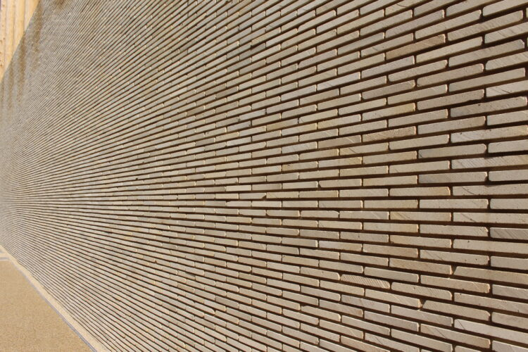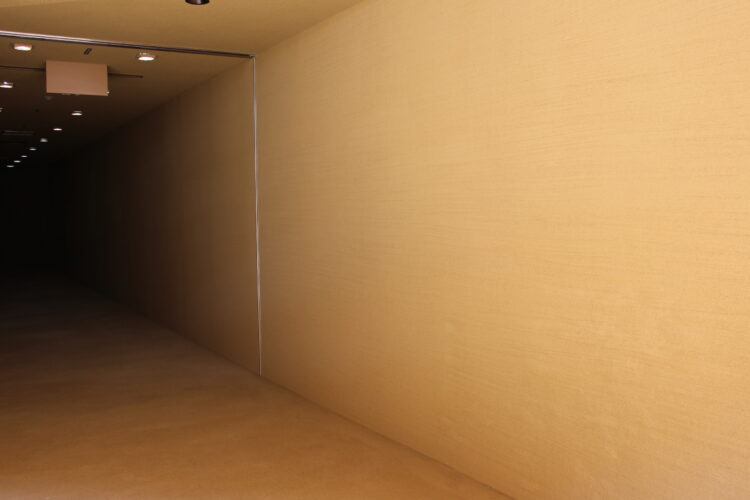平たく薄いレンガを積み上げた壁をぐるっと回りこんで入り口へいくと、どこかで見たような土壁が両サイドに。これは淡路島の土を使った土壁で、どうりで見たことがある紋様だと思ったわけだ。