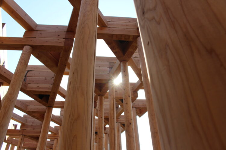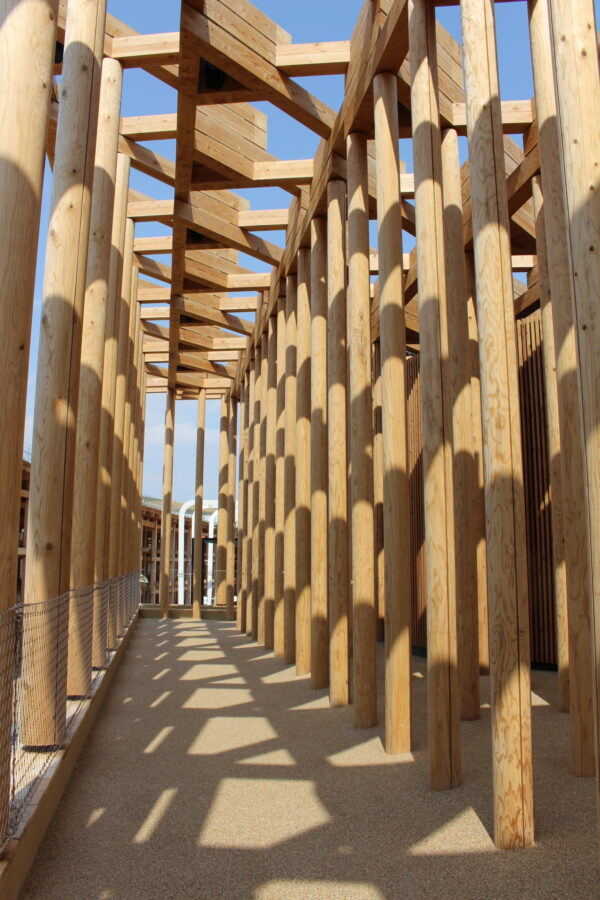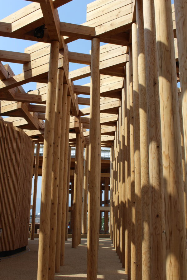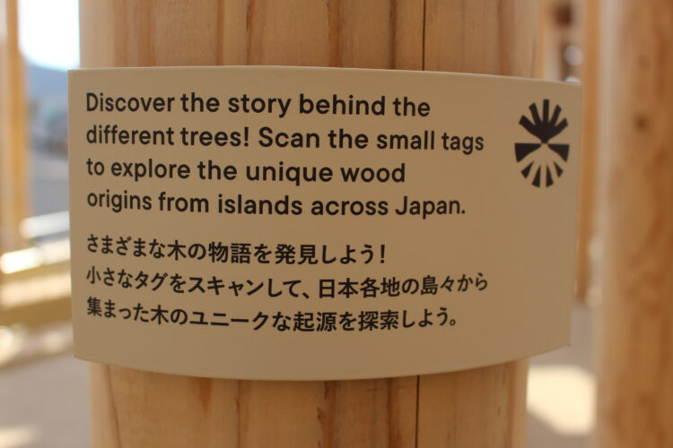 風通しの良い高さ8メートルの木造彫刻は森を象徴し、日本の木造文化とウズベキスタンの伝統的な寺院や宮殿の建築を参考にして建てられているそうだ。