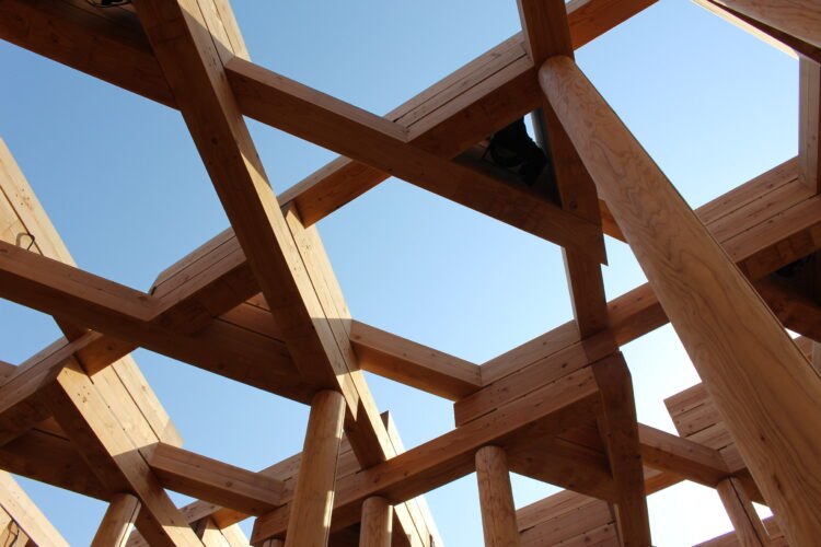 三角形の形をしていて、土台部分はレンガや粘土でできた素材を積み上げていて、2階部分は関西圏から集めてきた木材をふんだんに使用した作りになっていまる。2階は壁も屋根もない開放的な作りで、隣の大屋根リングと木造建造物の同志といったところか。