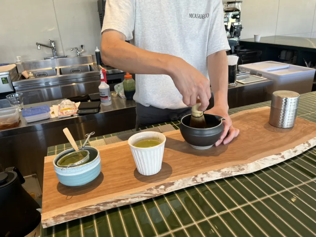 目の前で茶筅(ちゃせん)を点てて、でき立てを提供している。果実の色味が鮮やかな「マンゴー抹茶ラテ」や「抹茶ラズベリー」も展開している。