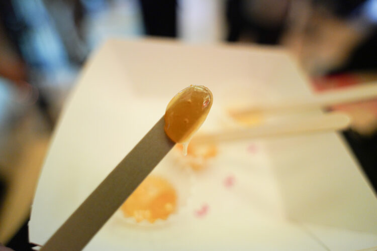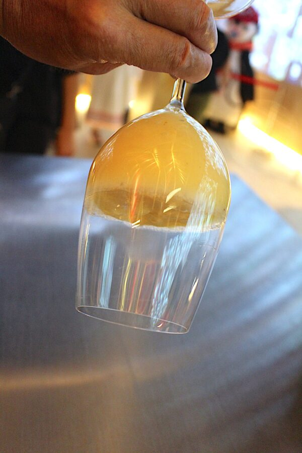 ハチミツの中にはかなり濃厚なものがあり、ワイングラスに入れて並べられていたものの中に、グラスを反対にしても流れ落ちないというハチミツがあった。