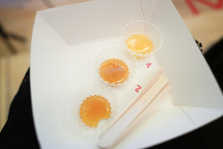 そのあと、会場のチリパビリオンに集まった人たちに、3種類のハチミツが配られ、それぞれに色の違いや香りの違いを確認して、味覚をチェックしていた。