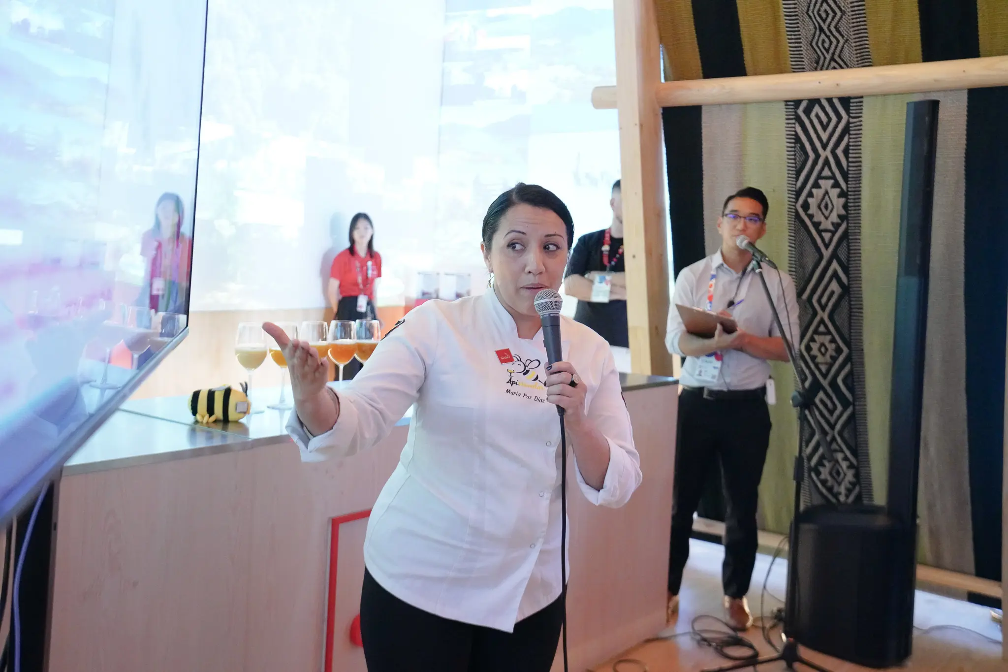 蜂蜜のソムリエ専門家であるマリア・パス・ディアス・メナさんを講師に迎え、チリ産ハチミツの特徴や視覚、嗅覚、そして味覚で試食などの説明が行われた。