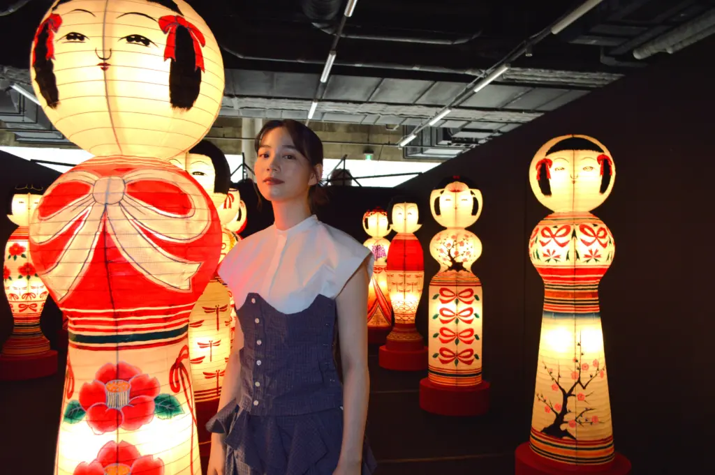 目玉の展示「こけし灯篭街道」は、津軽伝統工芸「こけし灯篭」の表面デザインを のん が行い、職人が絵付けを行った。新作10体を含む15体を黒い空間に一斉に配置し、表から見れば愛らしいこけしの背面に赤いリボンが群れのように貼り付く〝可愛くて、不気味〟な世界観を展開する。また、「こけし灯籠」のデザイン画も展示されており、制作過程にも触れることができる。