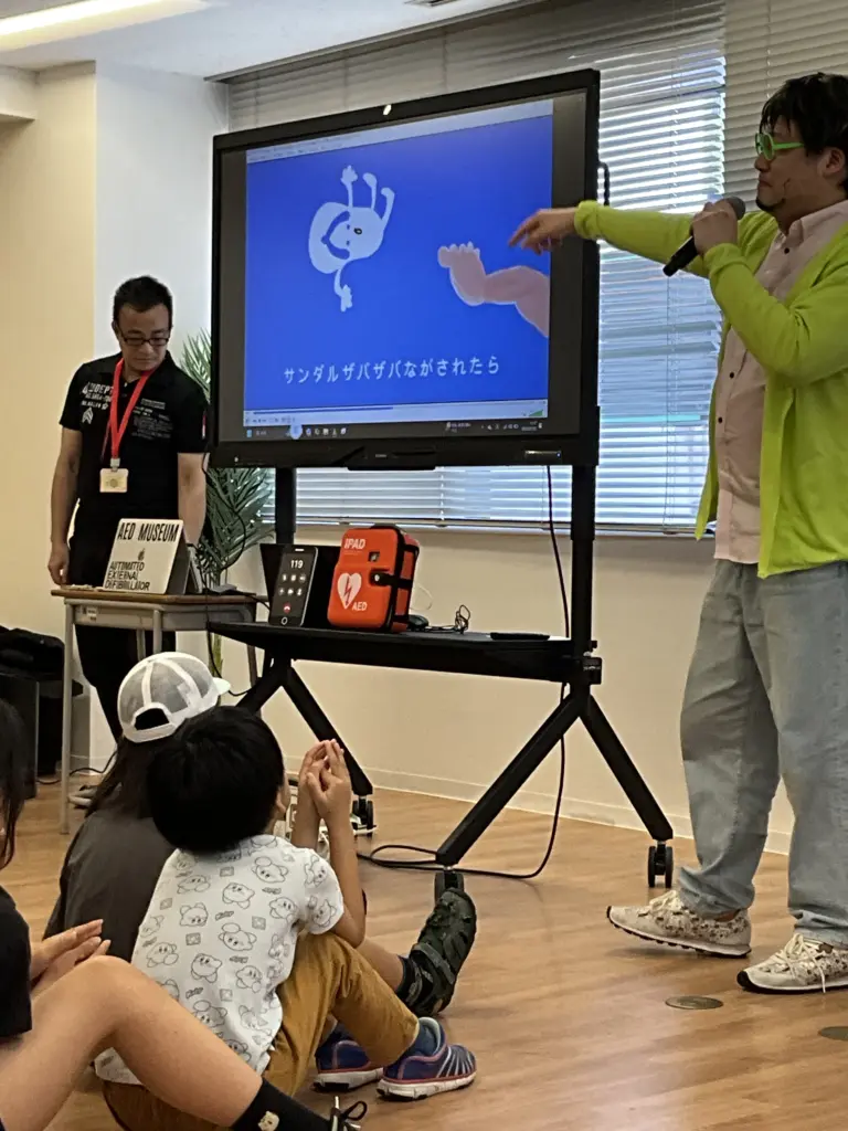 「AEDの使い方、知っていますか?」そんな問いかけから始まった、命の大切さを学ぶ特別授業が7月30日、大阪市淀川区にある「類設計室」3階で行われた。全日制フリースクール「類学舎」に通う子どもたち約60人が参加し、AED(自動体外式除細動器)の仕組みや正しい使い方、そして心肺蘇生の基礎を学んだ。