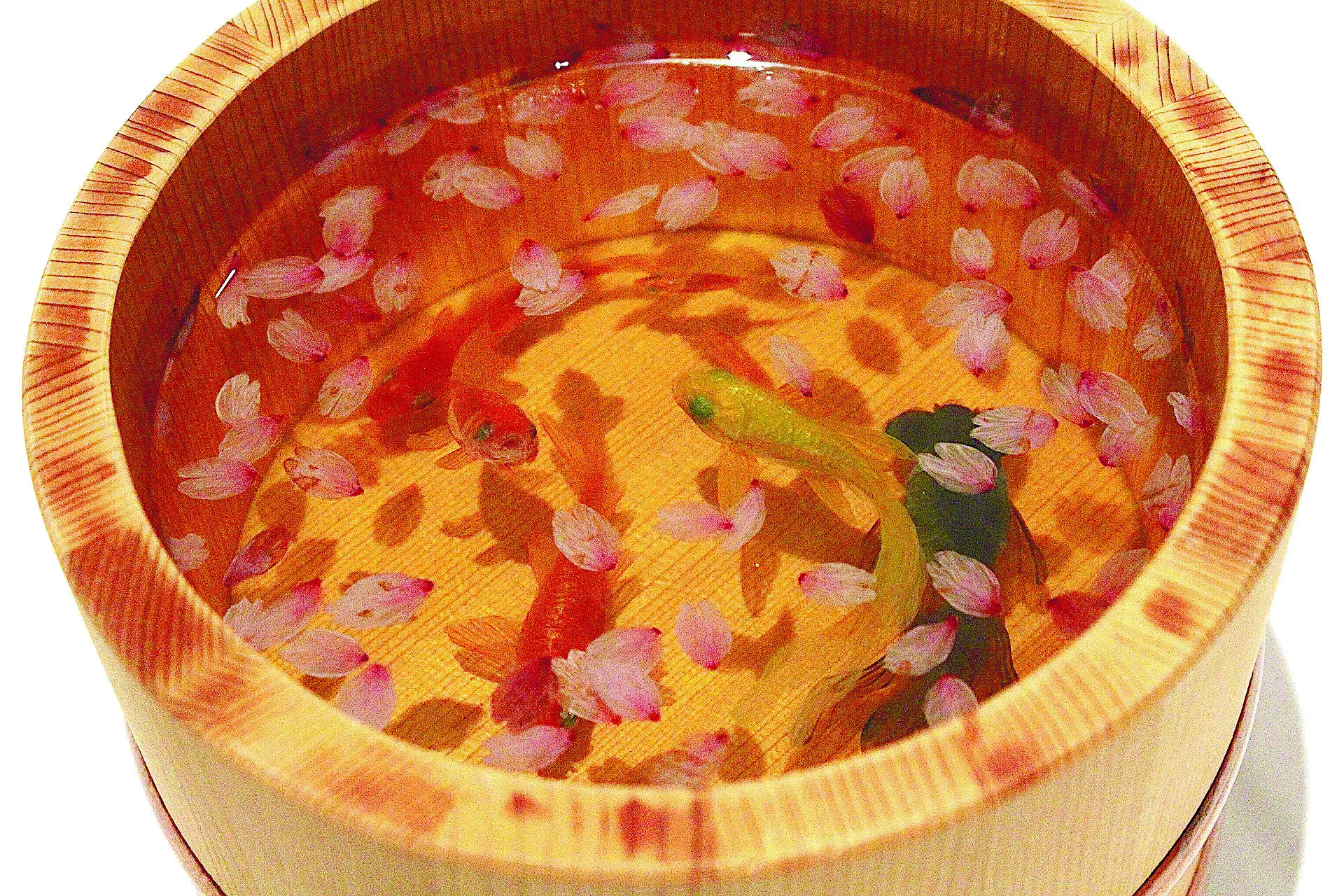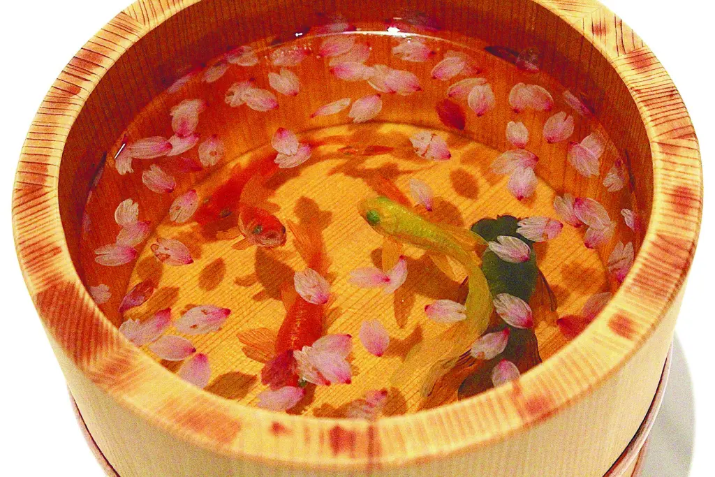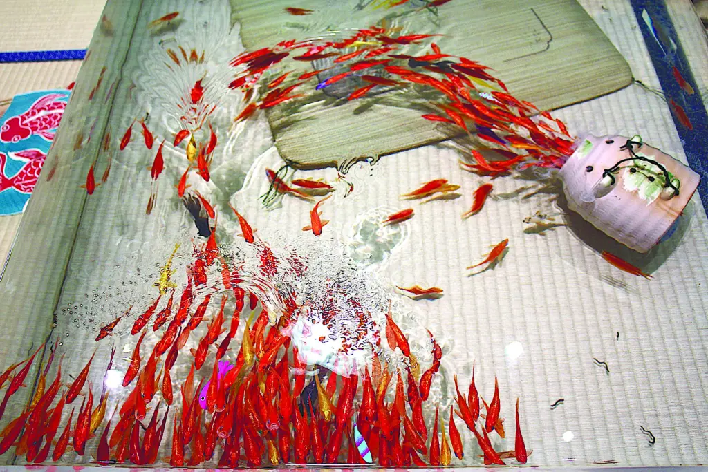 かつて樹脂を扱う会社で働いていた経験から、金魚と樹脂をミックスするアイデアが生まれた。升の中に樹脂を流し込み、その上に水性絵の具で絵を描き、その上にまた樹脂を流し込み絵を描く。これを繰り返して何層にも重ねることで、上から見るとまるで生きているかのような金魚が出来上がる。