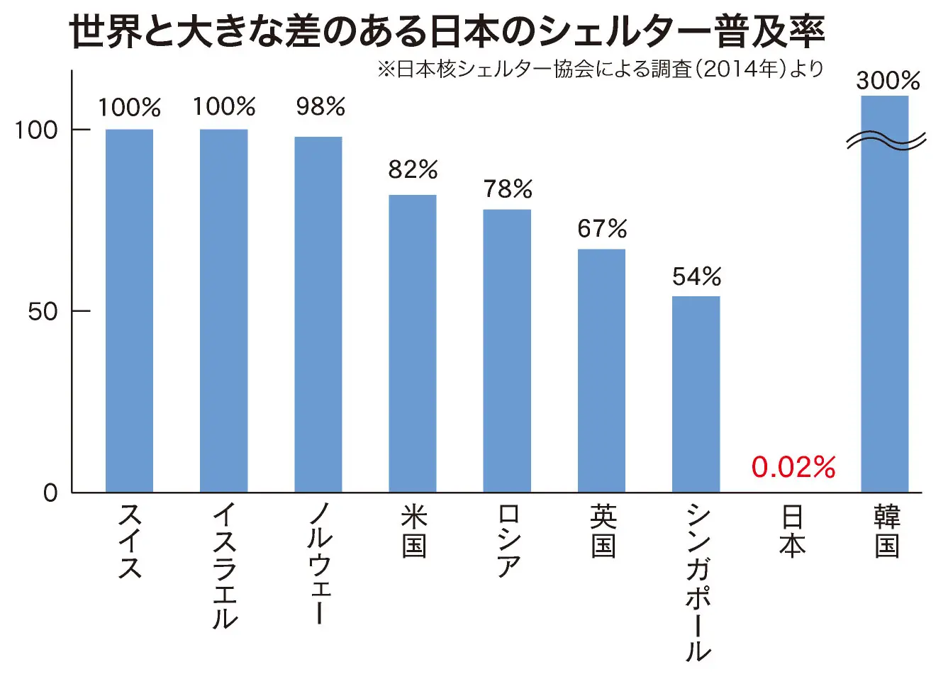 このシェルター、スイスや北欧諸国では、国主導で進められており、普及率は100%。お隣り韓国では地下鉄など公共インフラを含めると300%に達する。