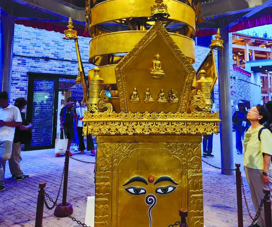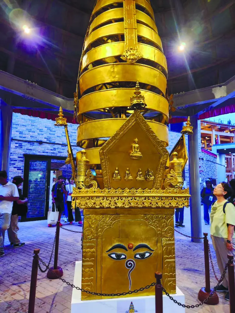 内部は2階建てで、1階にネパール料理や民芸品の販売、2階に仏教美術や伝統楽器を用いたヒーリング体験などが並び、百点以上の展示を通して同国の文化や精神性を伝える。精巧な仏塔模型も来場者の目を引く。