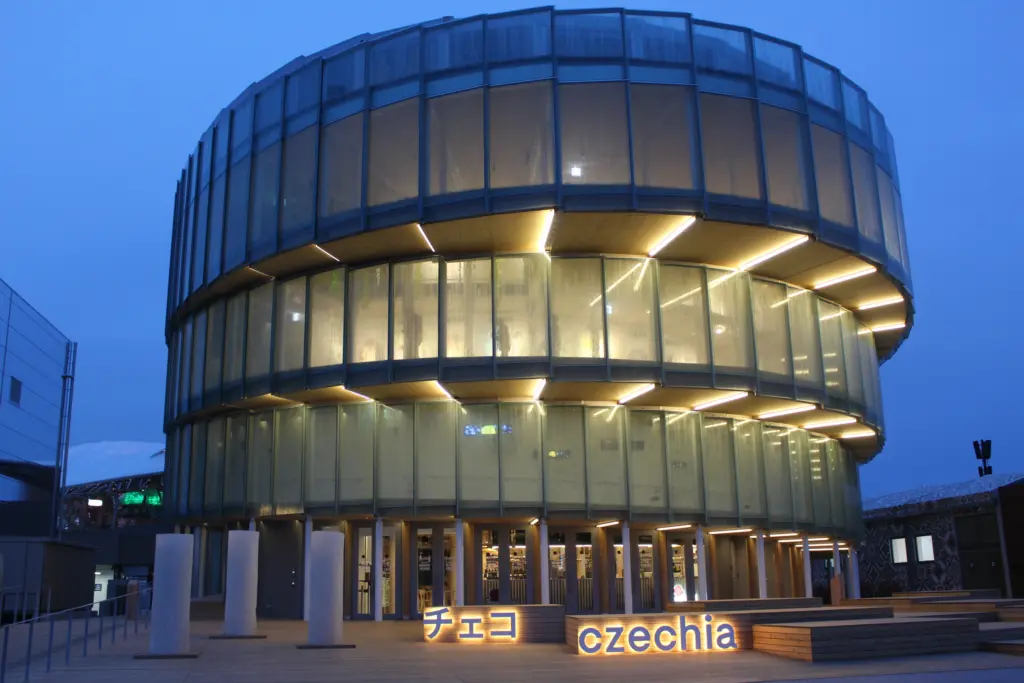 ボヘミアンガラスで覆われた円筒形の建物のチェコパビリオン。