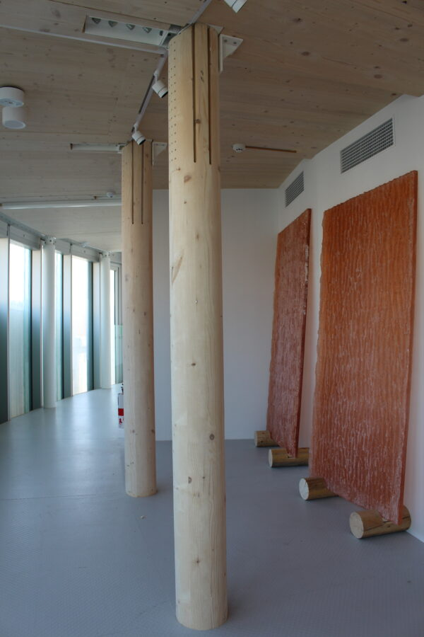 その前に立つ木の柱は、チェコから取り寄せた木材で、その強度が日本の木材より強く耐震性に優れているそうだ。