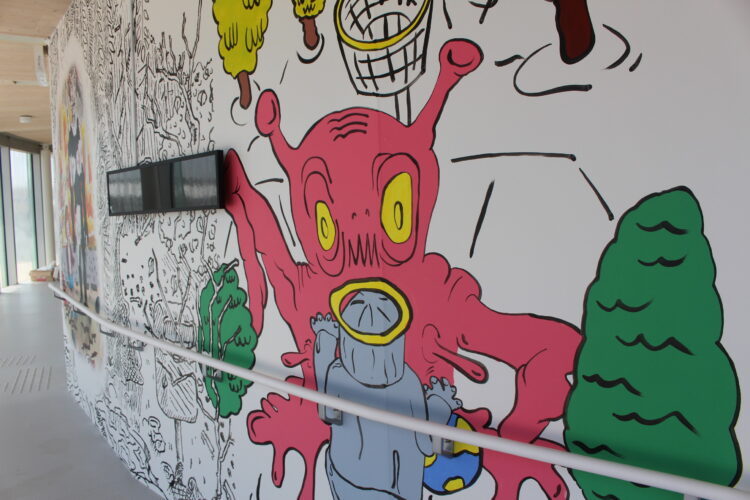 1階がカフェバーで、建物の左側の入り口から建物の周りを巡るように設置されている螺旋回廊を通って4階の屋上テラスまで移動していく。途中、所々にガラスのインスタレーションが置かれていたり、アーティストによる手書きのイラストが壁に描かれていて、来館者を迎えてくれる。