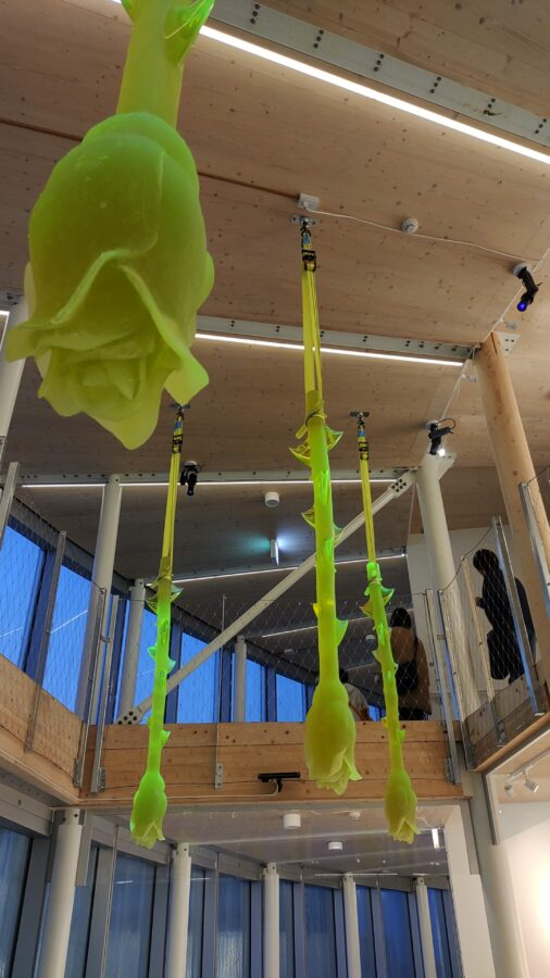 最後に登場するインスタレーションは、黄緑色で花を逆さまにして吊り下げている。