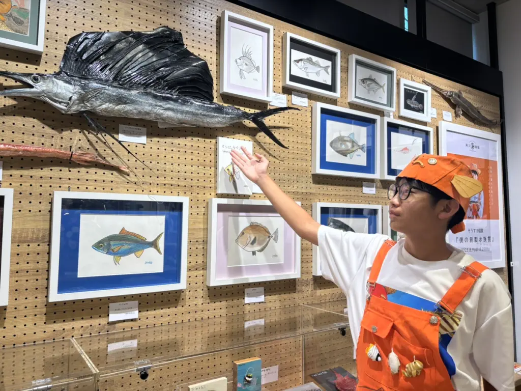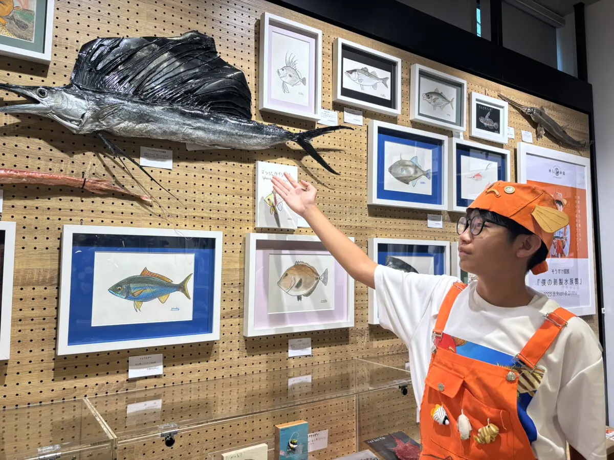 剥製は、魚類学者でタレントの「さかなクン」のYouTubeからやり方を学んだという。本人も魚の研究者を目指しており、「新種の魚を見つけるのが夢です」と語る。飾られる魚たちの〝リアルさ〟を通じて、彼の魚への情熱が垣間見える展覧会となっている。