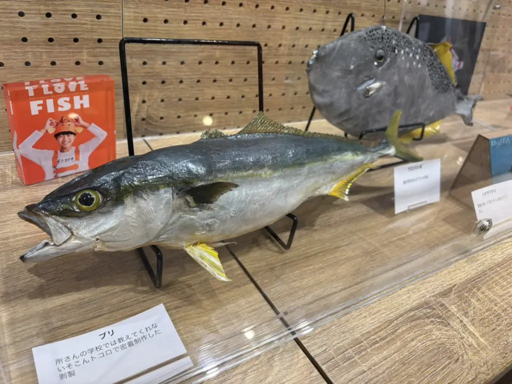 会場では、精巧な22匹の剥製展示のほか、魚を題材にした絵画22点を展示・販売。また関連グッズも並び来場者の関心を集めている。
