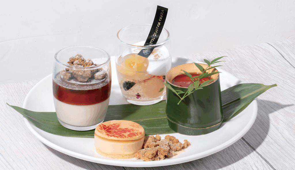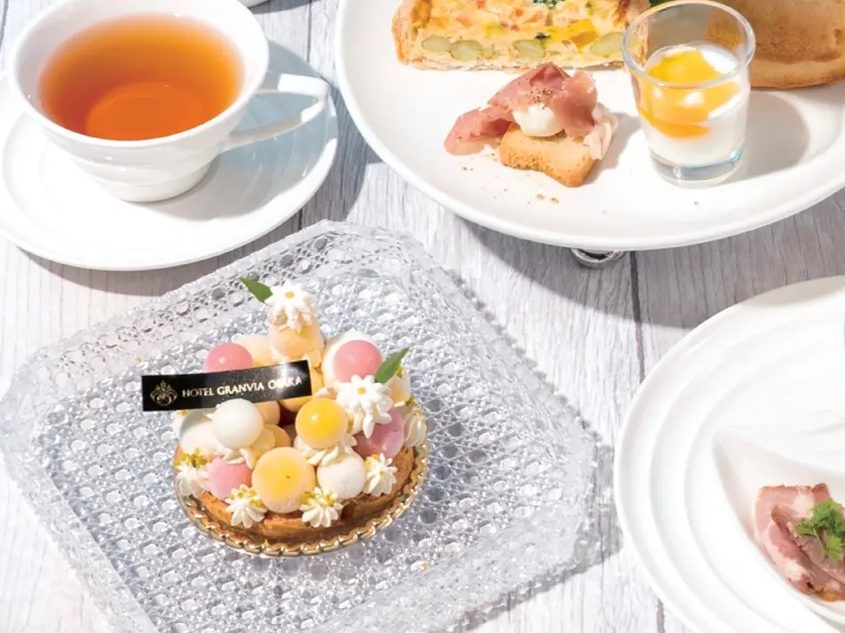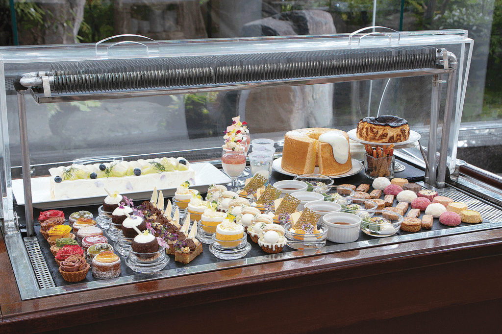 前菜は、2段のアフタヌーンティースタンドに色彩豊かに盛りつけられ、五感を満たすときめきのコースがスタート。メインには、素材本来の味を活かし、食べ疲れしない「キュイジーヌナチュール」の技法を用いた心と体にやさしい料理を。デザートタイムには、約20種類のホテル自家製スイーツが並ぶ「デザートワゴン」から、好みのスイーツを好きなだけ楽しめる。多くのスイーツはテイクアウトも可能で、自宅でも余韻を味わえるのが魅力。ランチからカフェタイムまでゆったり過ごせる新感覚のフレンチ体験だ。