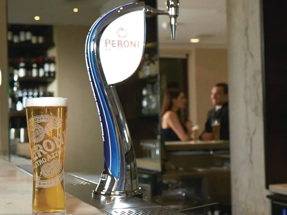 酷暑の今、ふらりと立ち寄れるホテルのバーは、まるで都会のオアシスだ。シェラトン都ホテル大阪では「夏のビールフェア-PERONI NASTRO AZZURRO-」と題して1963年にイタリア・ローマで誕生したプレミアムビール「ペローニ ナストロアズーロ」を特別料金で提供している。バランスの取れた苦味と、柑橘系のスパイシーな香り、すっきりとした後味が特徴で、暑い季節にぴったりだ。「レストラン&ラウンジ・バーeu」のエントランスに、ブランドの世界観を表現した特大パネルを掲示し、気軽に立ち寄れるスペースを設置。その他、館内の「中国料理 四川」「日本料理 うえまち」でも提供している。