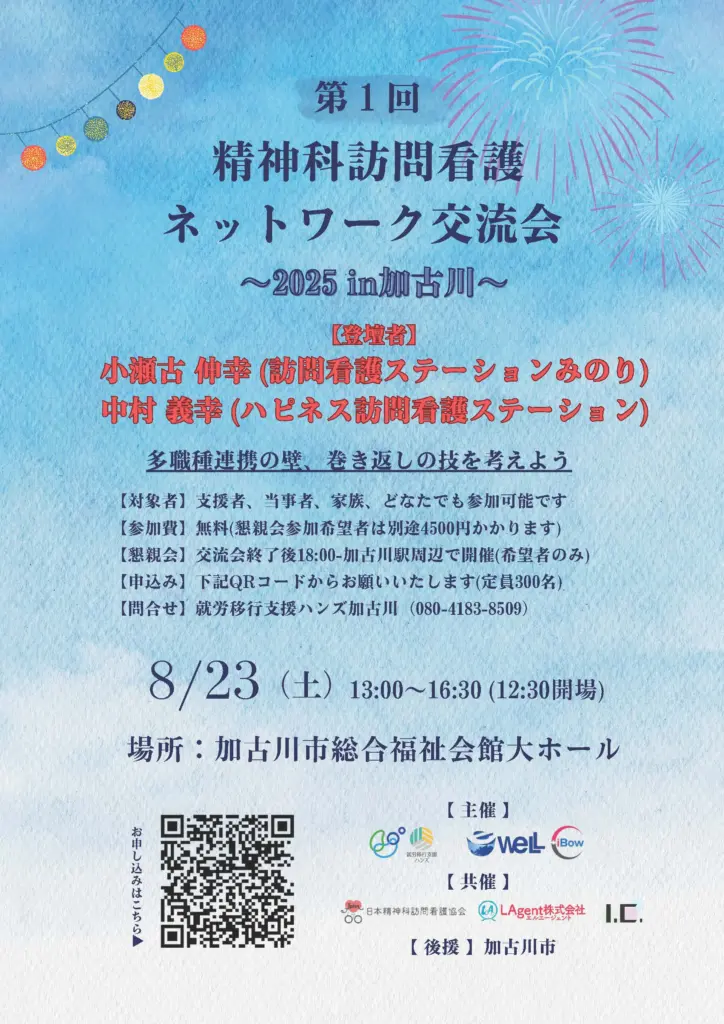精神科訪問看護との連携をテーマにした交流セミナー「第一回、精神科訪問看護ネットワーク交流会~2025in加古川~」が8月23日(土)、午後1時から午後4時半まで加古川市総合福祉会館、大ホールで開催される。主催は大阪府下で4カ所、就労移行支援事業所「ハンズ」を運営するミチルワグループ。定員300人、参加無料。支援者、当事者、家族に広く開かれたセミナーで、終了後は有料で懇親会がある。