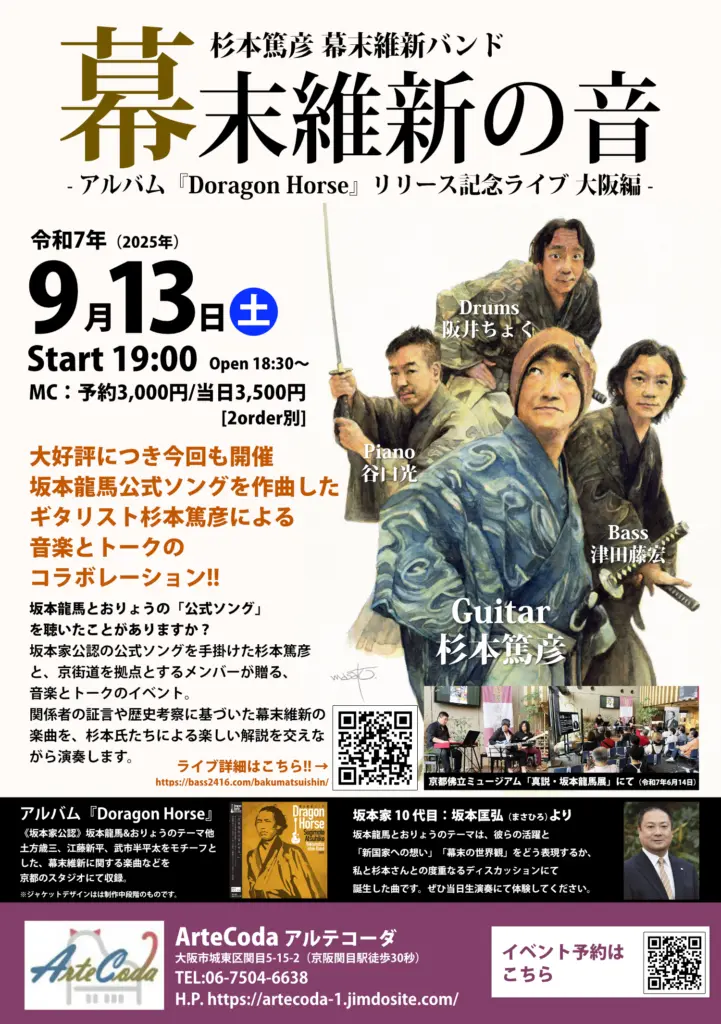 坂本龍馬の生誕190周年を記念したコンサート「幕末維新の音」が、9月13日午後7時から大阪市城東区のライブスペース「関目アルテコーダ」で開催される。料金は3,500円。今年9月にリリースされるコンピレーションアルバム『Dragon Horse(ドラゴンホース)』の発表を記念した公演で、幕末維新の時代をテーマにした楽曲とトークを交えて届ける。