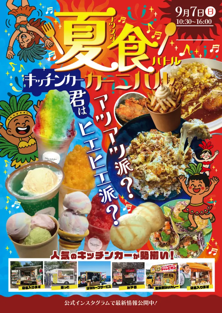 イベントのテーマは「夏食バトル!君はアツアツ派?ヒエヒエ派?」。キーマカレー、タコス、かき氷など、スタミナ満点のアツアツグルメから暑さを吹き飛ばす冷たいスイーツまで、多彩なキッチンカーが勢ぞろい。各店が“夏の推しグルメ”を披露する。