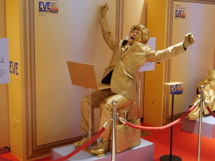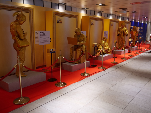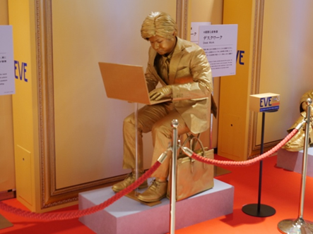 会場では、頭から足先まで全身金色で固めた5人のパフォーマーが、微動だにせず、それぞれ肩こりを生み出すポーズをしていて、前を通る一般客の度肝を抜いている。