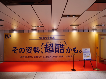 エスエス製薬が肩こりにも効く鎮痛剤「金のEVE」の啓発イベントとして、「超酷な姿勢展」を8月24日まで、大阪駅前地下道中央エリアで開催している。