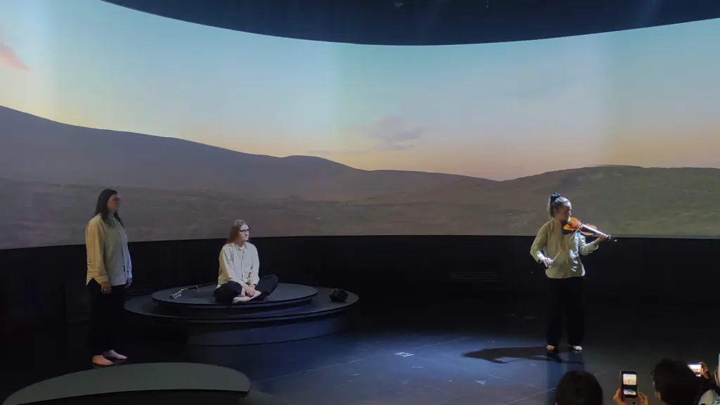 アイルランドパビリオンでは変則スケジュールを採用していて、午前と午後に、筆者が参加したガイドツアーとパフォーマンスの鑑賞をするコースが複数回行われ、それ以外に午前9時から10時と午後7時半から同8時45分は予約なしで自由に来館できるが、パフォーマンスは行われない。逆に午後6時からは特別パフォーマンスを見る回があり、ガイドツアーの後に観るパフォーマンスに追加メンバーが加わり4から5人でパフォーマンスを行う。観客は45分程度じっくりパフォーマンスを楽しむことができる。この間、ほかの部屋も開放されているので、自由に見て回ることも可能だ。