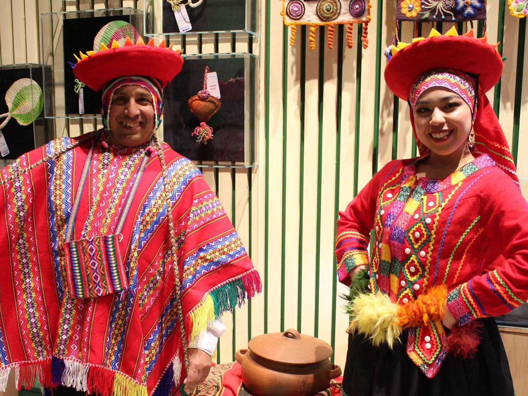 映像を見終わると、隣の空間では日本とペルーの友好を示すタペストリーが飾られていて、これは山形大学のナスカ研究の成果を紹介したもの。またペルーの代表的な料理であるセビーチェやペルー産スーパーフード、スペシャリティコーヒー、ビスコサワーなどの試飲や試食ができたり、民族衣装を纏(まと)った男女が被写体になって訪問者の写真撮影希望に応えていた。