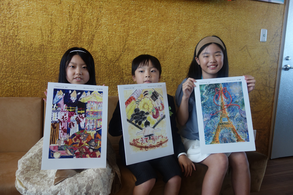 このほか、高学年の部銅賞は静岡県の羽田笑舞さん(4年)「伝統のサクラとあこがれの駿府城」、低学年の部銅賞は岡山県の有本充希さん(2年)「みんなでぱくぱくわがし」、フランスパビリオン賞は北海道の縄乃々香さん「わかちあうって、愛だね」が受賞した。
