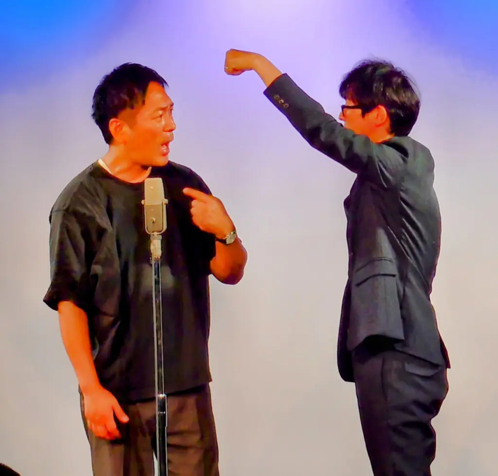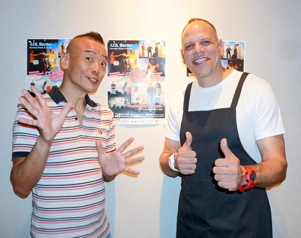 リニューアル初回公演を終えたのぶよしとジャボリは観客見送りを終え取材に応じた。「英語だけの公演、と言っても半分は日本の方。分かりやすい英語で外国の方も皆一緒に笑ってもらえないと意味が無い。出演者の中には普段英語を遣わない座員も多いので、そこは僕らや武蔵君が英語でのせりふ言い回しをアドバイスしながらしっかり物語を仕上げて行きたい。慣れてくれば英語でのアドリブも皆自然に出てくるはず。将来は小中学校で英語を学んでいる日本の子ども達にも見てもらいたい」と手応えを感じている。